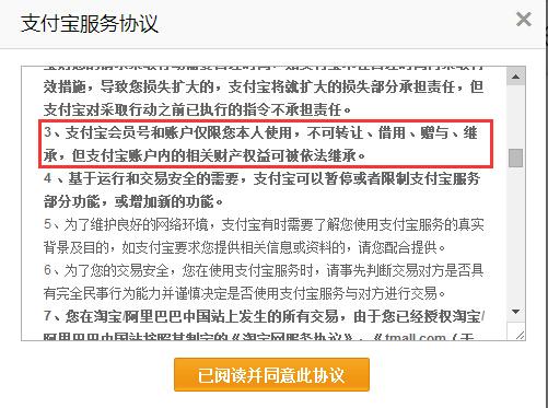 也許看到這里你會很奇怪,這么重要的問題難道開發(fā)者就沒想過嗎?答案是有的,開發(fā)者不但想到了這個問題,還曾和我們每個人分享過他們的想法。以支付寶為例,在注冊協(xié)議中,明確寫有關(guān)于此類事件的處理方式。不過遺憾的是,我們大多數(shù)人都選擇了忽略這條信息。