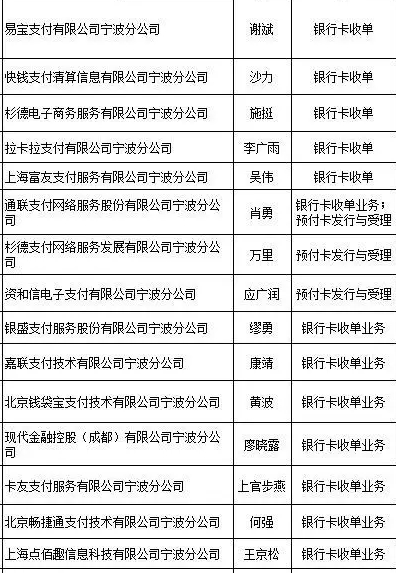 易寶支付有限公司寧波分公司、快錢支付清算信息有限公司寧波分公司、杉德電子商務服務有限公司寧波分公司、拉卡拉支付有限公司寧波分公司、上海富友支付服務有限公司寧波分公司、通聯支付網絡服務股份有限公司寧波分公司、杉德支付網絡服務發展有限公司寧波分公司、資和信電子支付有限公司寧波分公司、銀盛支付服務股份有限公司寧波分公司、嘉聯支付技術有限公司寧波分公司、北京錢袋寶支付技術有限公司寧波分公司、現代金融控股(成都)有限公司寧波分公司、卡友支付服務有限公司寧波分公司 、北京暢捷通支付技術有限公司寧波分公司、上海點佰趣信息科技有限公司寧波分公司、中銀通支付商務有限公司寧波分公司。