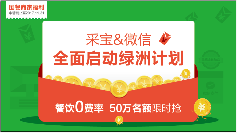采寶攜手微信全面啟動“微信綠洲計劃”,采寶圍餐商戶即刻加入,即刻減免微信6‰的費率哦!